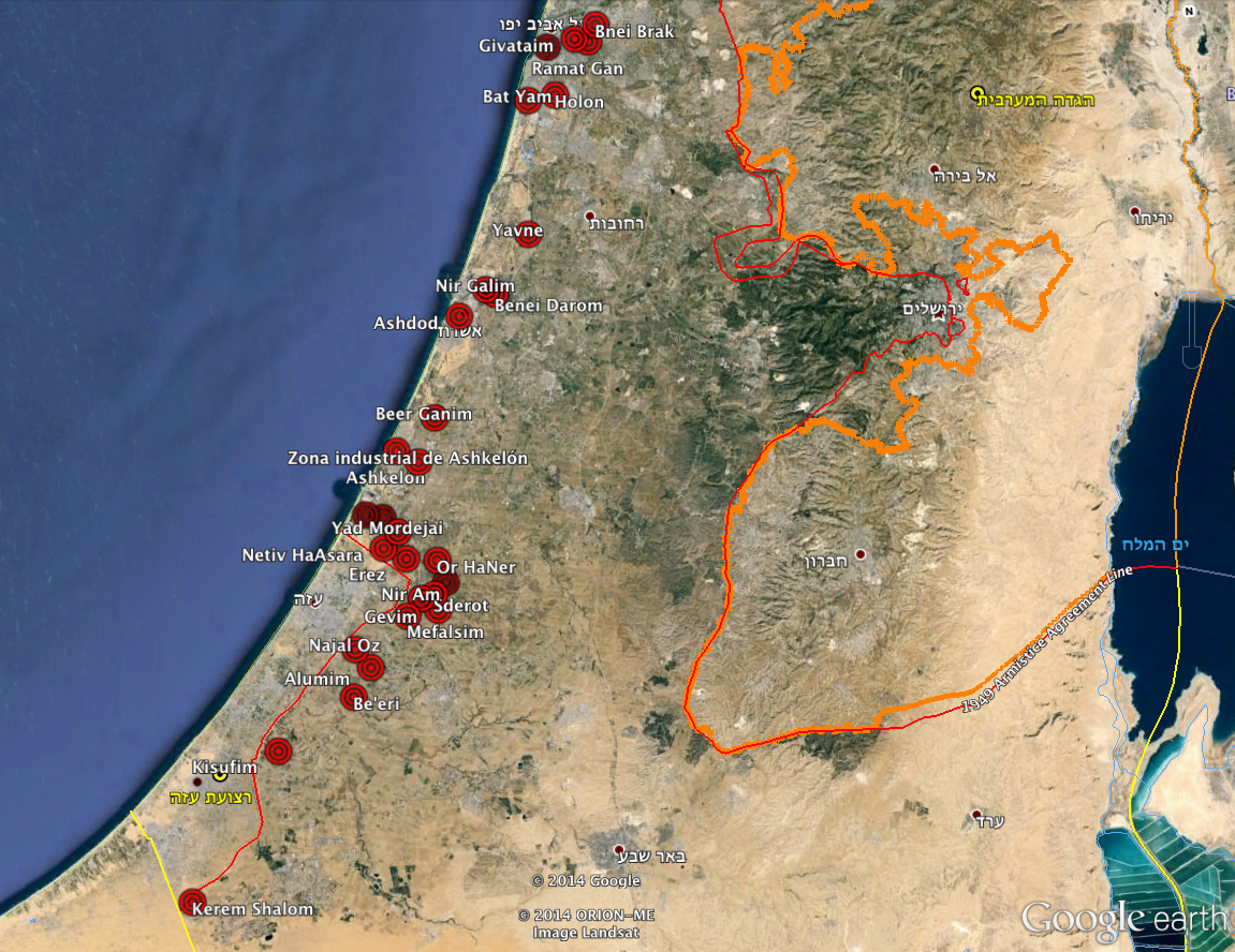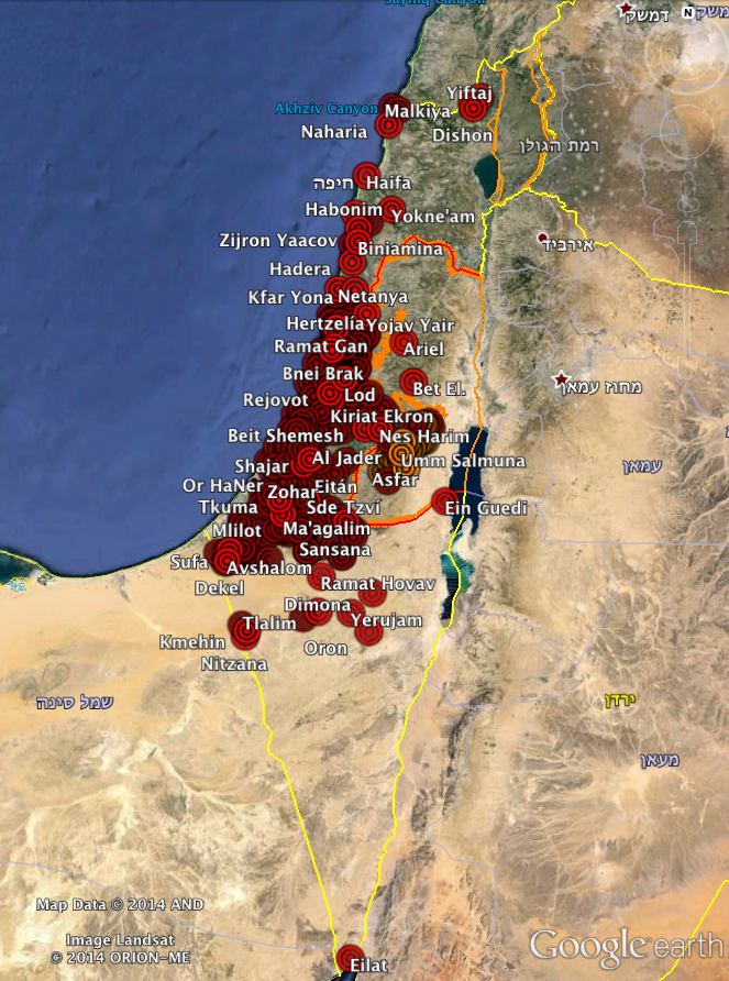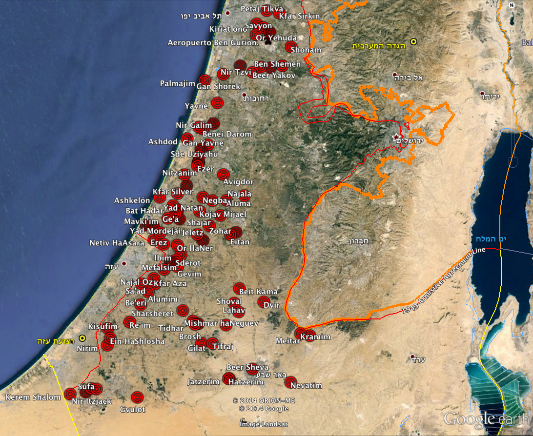 Todas y cada una de las localidades israelíes (en naranja las palestinas) donde sonaron las alarmas antiaéreas y del Tzeva Adom en el plazo de un mes.