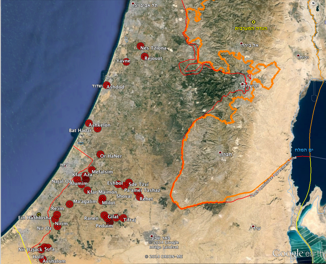 Mapa con las localidades donde sonaron las sirenas antiaéreas. El rango de alcance es cada vez mayor y aproximándose al centro del país. Nes Tziona está a escasos 20 kilómetros de Tel Aviv